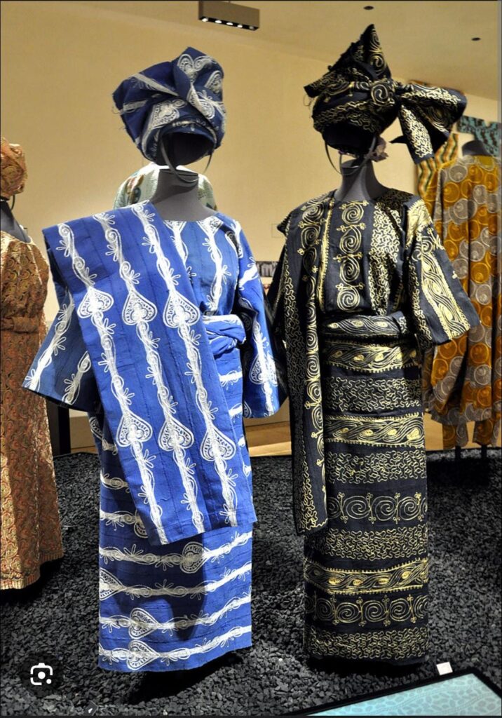 Yoruba attire reflects elegance, identity, and status. Men often wear agbada (flowing robes) or buba with sokoto (trousers), while women wear iro (wrapper), buba (blouse), and gele (head tie). These outfits are made from rich fabrics like aso-oke, lace, and ankara, often reserved for celebrations.